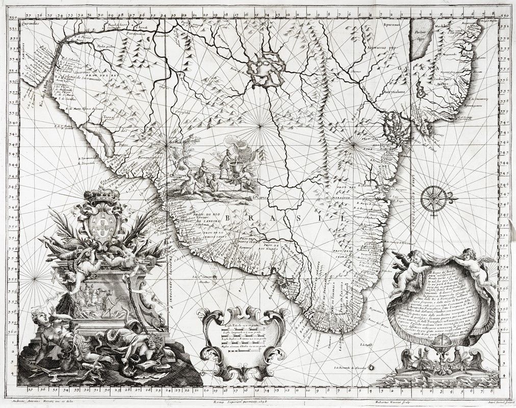 Incisione in rame. mm 460x587. Foglio: mm 488x640. Al margine inferiore da sinistra a destra le indicazioni di responsabilità a partire dal nome del disegnatore Andrea Antonio Orazi fino a quello dell'incisore Hubert Vincent. Al centro il privilegio e la data "1698". Mappa facente parte delle ventitre a corredo del raro resoconto di Padre de Santa Teresa sulla guerra coloniale olandese-portoghese. La mappa è orientata con l'Occidente in alto, in basso a sinistra imponente cartiglio allegorico, al centro la scala miliaria in leghe tedesche, spagnole, francesi, inglesi e italiane, a destra un secondo grande cartiglio con una lunga annotazione. Al centro un'elaborata vignetta con atti di cannibalismo. Carta vergellata con filigrana in cerchio singolo sormontata da lettera "N".