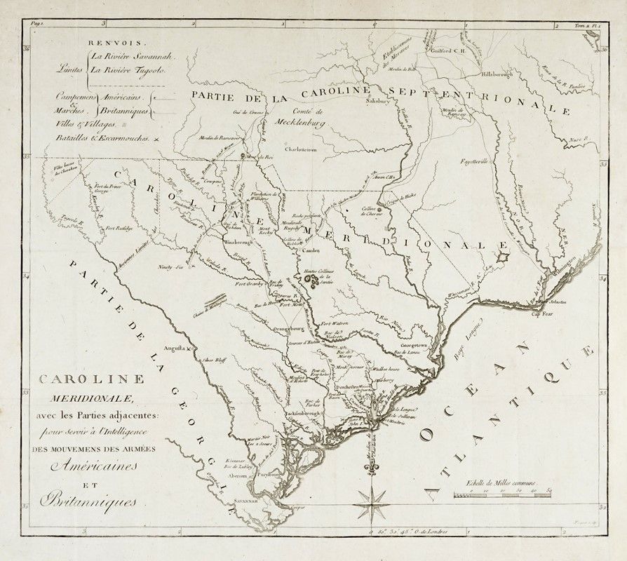 Incisione in rame. mm 375x422. Foglio: mm 408x458. Mappa della Carolina del Sud del tempo della rivoluzione tratta dall'edizione francese di The History of the Revolution of South Carolina di David Ramsay, Trenton: Isaac Collins, 1785. La mappa raffigura i luoghi di tutte le battaglie combattute nella Carolina del Sud durante la Rivoluzione americana, nonché le marce e le ritirate di molte delle forze principali nell'arco della guerra.