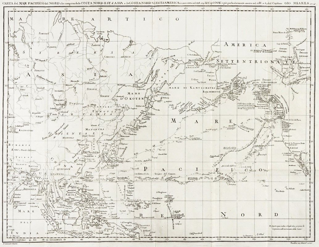 Incisione in rame. mm 445x580. Foglio: mm 455x635. Rara mappa dell'Alaska e della costa nordoccidentale dell'America e della costa nordorientale dell'Asia, incisa per illustrare l'edizione italiana del racconto di John Meares, Viaggi dalla China alla costa Nord-Ovest d'America, fatti negli anni 1788 e 1789 dal Capitano G. Meares, Firenze 1796. Il volume venne particolarmente apprezzato per le informazioni sulle popolazioni indiane del Nord America, di cui il navigatore inglese descrive abitanti, villaggi, lingua, usi e costumi. La versione stampata a Firenze è impreziosita da 22 illustrazioni, che includono questa grande Carta del Mar Pacifico del Nord raffigurante le coste dell’Asia e dell'America del nord, un ritratto dell'Autore inciso da Vascellini, portolani, mappe e vedute, raffigurazioni di indigeni.