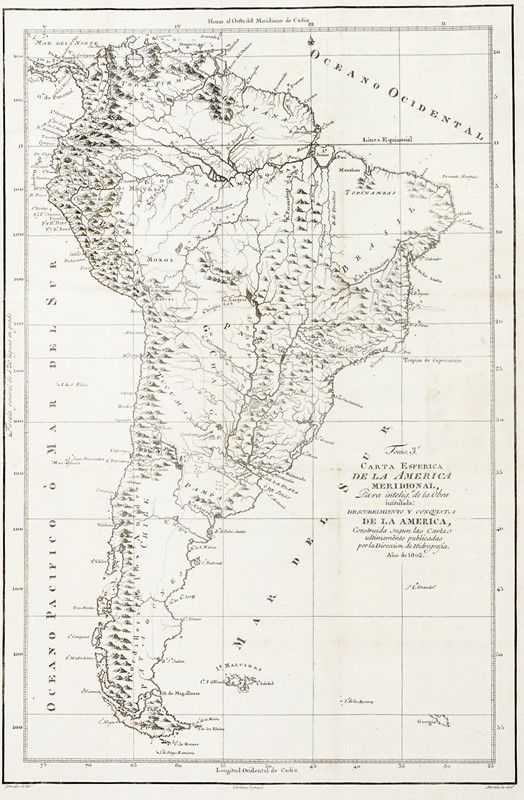 Incisione in rame. mm 505x335. Foglio: mm 530x358. Tratta da Juan Corradi, Descubrimiento y conquista de la América o Compendio de la historia general del Nuevo Mundo, Madrid, Imprenta Real, 1803 (traduzione di William Robertson, History of America, Edinburgh,1777). Al margine in basso le indicazioni di responsabilità: Tomás González (autore principale), José María Cardano, Felipe Cardano (incisori), Juan Morata y Gangoiti (incisore del testo). Rara mappa di Messico, Texas, Alta e Bassa California, Montagne rocciose e regioni contigue, pubblicata in Spagna all'inizio del XIX secolo. Affascinante restituzione topografica, finemente incisa e con buona rappresentazione dell'idrografia dei fiumi della regione, sebbene conservi un lago senza nome, Timpanagos e un Rio de Dolores che sfociano nella baia di San Francisco. La mancanza di dettagli nella mappa è probabilmente un prodotto della dottrina spagnola della segretezza nelle regioni allora controllate dalla Spagna: consentiva una rappresentazione topografica della regione ma ometteva i nomi dei luoghi.