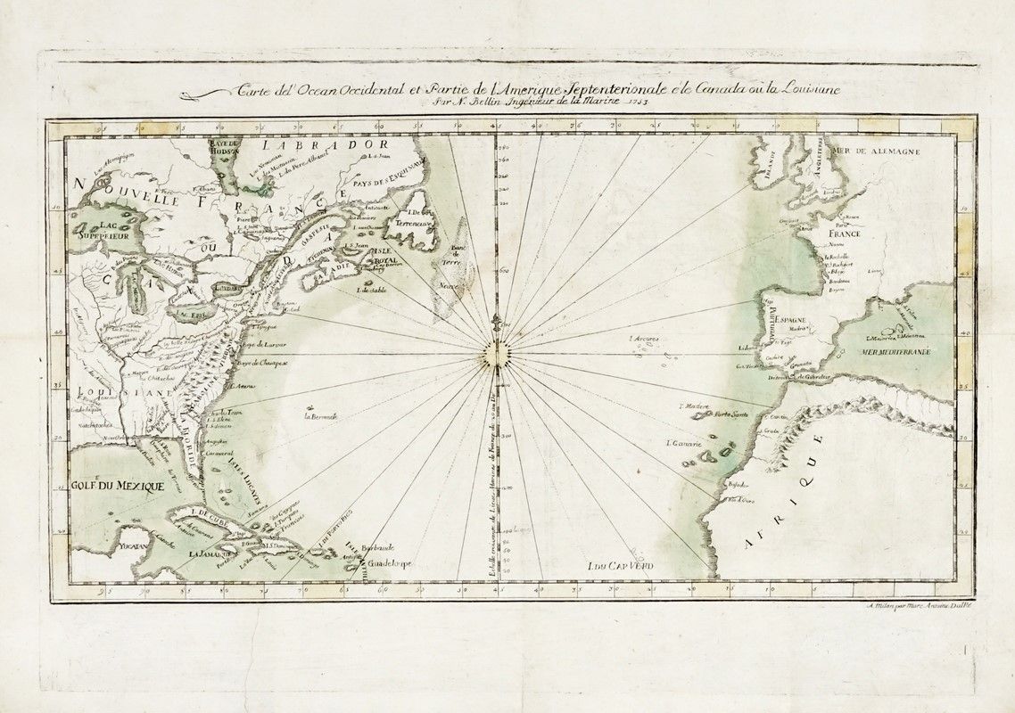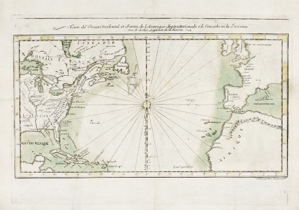 Incisione in rame. mm 255x385. Foglio: mm 266x415. Mappa delle regioni colonizzate del Nord America, e delle isole caraibiche rappresentate in rapporto con le coste dell'Europa e dell'Africa. Tratta da Pierre-François-Xavier de Charlevoix, Histoire et description générale de la Nouvelle France avec le journal historique d'un voyage fait par ordre du roi dans l'Amérique septentrionnale, Paris 1744. SI AGGIUNGE: Id., Id., Incisione in rame in coloritura. mm 250x430. Foglio: mm 352x485. Milan: par Marc Antoine Dal Re, 1753. Mappa della metà orientale del Nord America e dell'Atlantico, nell'edizione 1744 destinata a illustrare l'opera di Charlevoix sul Nord America.