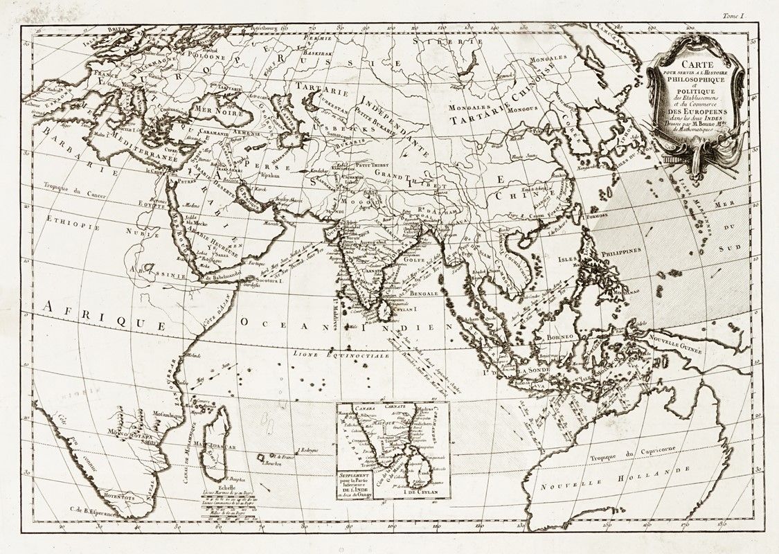 Incisione in rame. mm 350x488. Foglio: mm 373x502. Tratta da Guillaume-Thomas Raynal, Histoire philosophique et politique des établissemens et du commerce des Européens dans les deux Indes, Geneve 1780. Questa interessante mappa del mondo copre quasi tutte le masse continentali dell'Africa, dell'Europa, dell'Asia e dell'Australia. I dettagli interni sono relativamente scarsi a parte fiumi, nomi di luoghi sporadici, topografia pittorica e alcuni punti di interesse degni di nota come la Grande Muraglia cinese e varie rotte commerciali. All'interno dei mari si notano gli alisei e le correnti (comprese le variazioni stagionali), insieme ad alcuni pericoli per la navigazione come barriere coralline o secche. Le coste incomplete lungo la Nuova Guinea e il nord del Giappone riflettono i modelli di esplorazione in corso, e una mappa nel riquadro in basso al centro fornisce ulteriori dettagli sulla punta meridionale dell'India e su Ceylon.