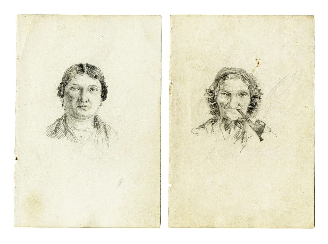 Matita nera su fogli di taccuino in carta bianca non vergellata. mm 164x115. Cinque teste di carattere verosimilmente tratte dal vero, appunti di un artista attivo nei primi decenni ed entro la prima metà del XIX secolo.