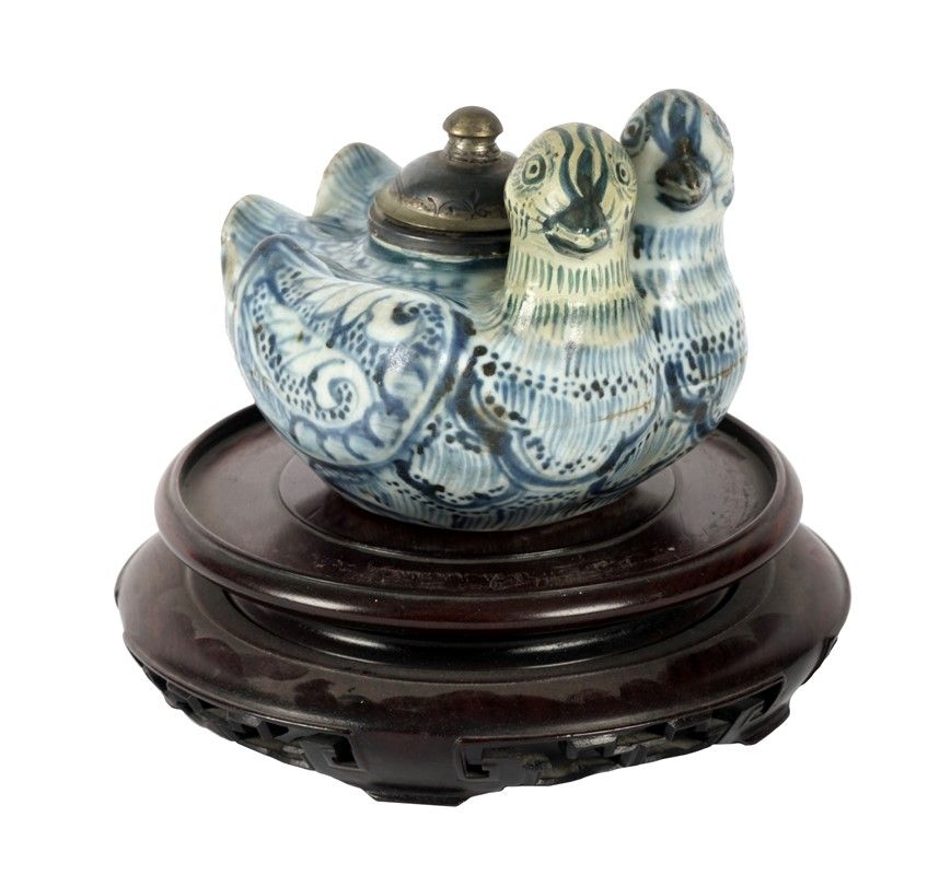 Porcellana modellata a stampo con decoro dipinto sottocoperta all'ossido di cobalto e complementi in argento bulinato. h.9,5 cm x l. 11 cm. Provenienza: collezione baronessa Marion Barton Muzi Falconi; collezione Maria Pia Brogi. Vaso modellato in forma di due anatre mandarine che nuotano affiancate e con la testa rivolta da un lato. Il ventre delle due anatre, piatto, funge da base per il vaso, mentre nel punto all'interno dove le ali si toccano si trova un'imboccatura circolare con labbro rivestito di lamina d'argento sul quale alloggia un coperchio semisferico con bottone di presa "a bulbo" e bordo decorato a bulino con motivo a palmette. L'esame e la descrizione dell'oggetto sono stati condotti da Roberto Ciarla.