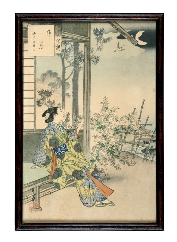 Nishiki-e (Xilografia a colori). Formato: oban verticale (mm 310x205). Editore: Akiyama Buemon. Serie: Sanjûroku kasen (trentasei bellezze a confronto). Data: 1893 (Meiji 26). Dodici tavole in vecchia cornice a listello laccata con marezzatura opaca.