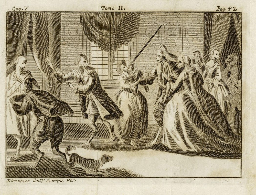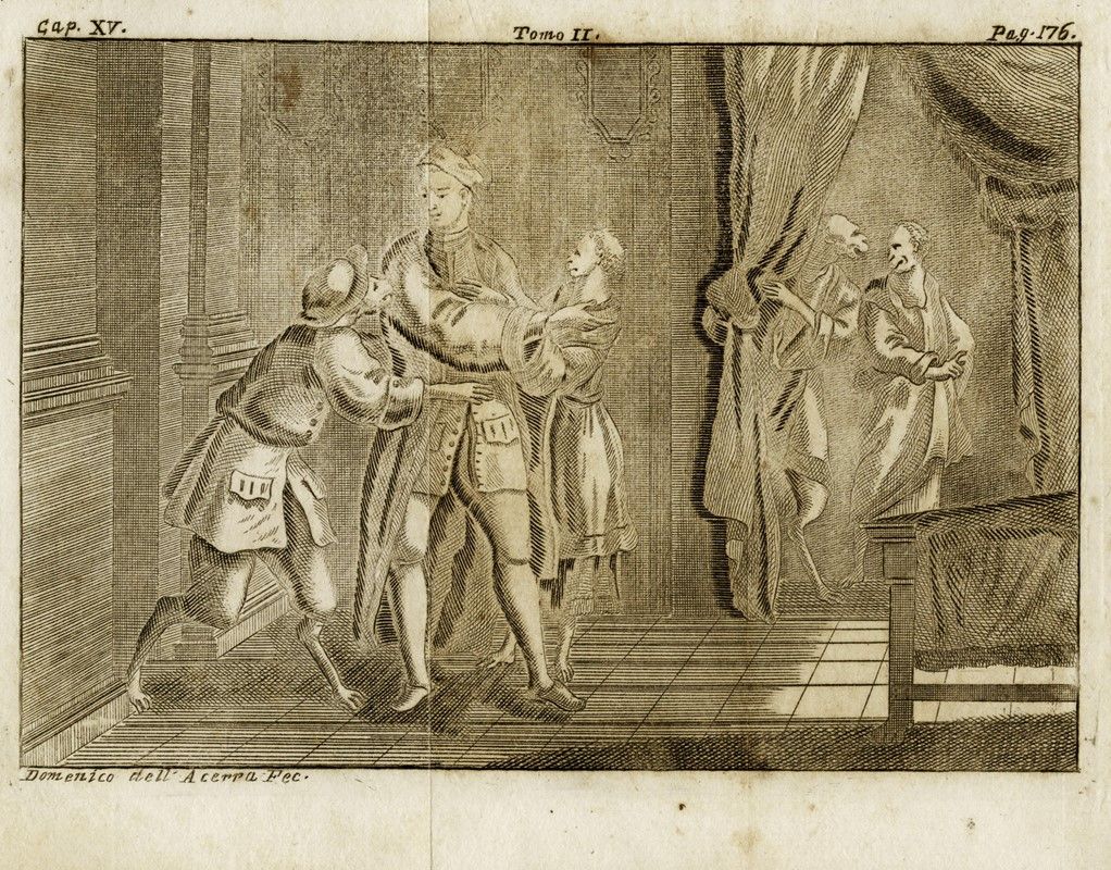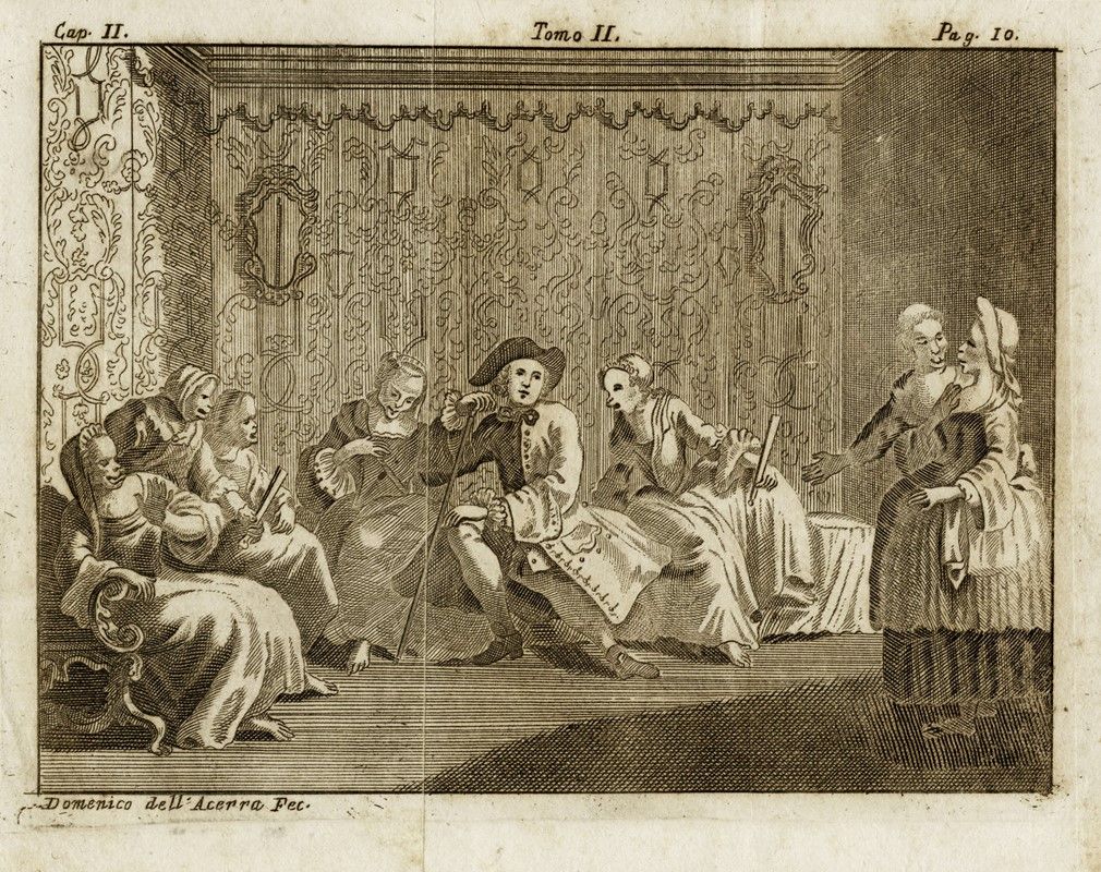 Acquaforte. mm 153x210. Foglio: mm 175x230. Dodici tavole per le illustrazioni del volume di Zaccaria Seriman (sotto lo pseudonimo dell'inglese Enrico Wanton), Viaggi di Enrico Wanton alle terre incognite australi, ed ai regni delle scimie, e de' cinocefali nuovamente tradotti da un manoscritto inglese. 1764. In questo viaggio immaginario nelle terre sconosciute dell'Oriente e dell'Emisfero australe, su modello del Gulliver swiftiano, Seriman affronta le principali problematiche del suo secolo immaginando differenti modelli culturali e societari, con una pungente satira soprattutto della società veneziana del tempo. Il volume venne corredato di illustrazioni con scimmie in vesti umane.
