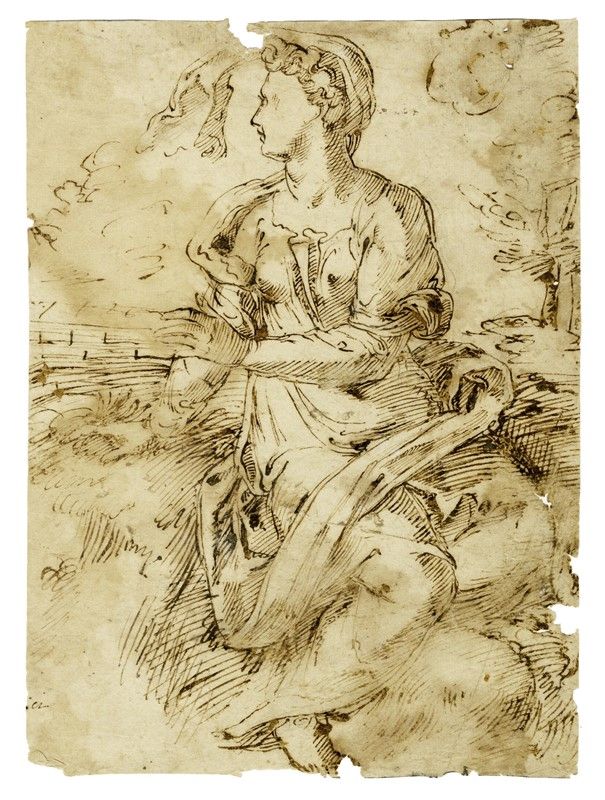 Penna e inchiostro bruno su carta vergellata apparentemente priva di filigrana. mm 270x202. Si veda versione presso Städel Museum, Frankfurt am Main (inv.3910) (https://sammlung.staedelmuseum.de/en/work/sitzende-frau-mit-fliegendem-schleier-in-einer-landschaft-na).