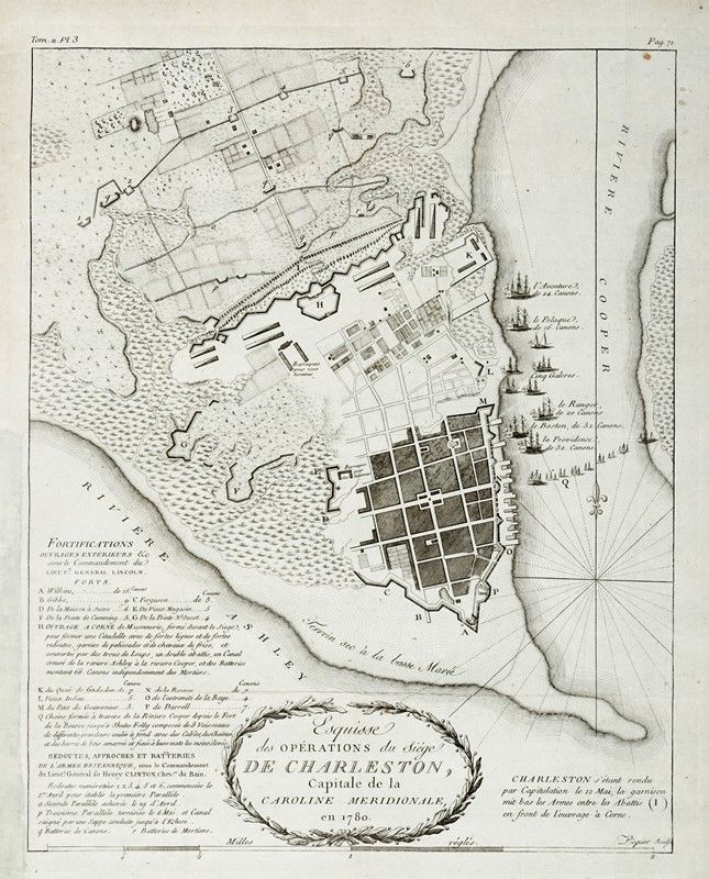 Incisione in rame. mm 370x300. Foglio: mm 395x345. Rara mappa dell'assedio di Charleston tratta dall'edizione francese di The History of the Revolution of South Carolina di David Ramsay, Trenton: Isaac Collins, 1785. Ramsay era residente a Charleston ed è noto per i suoi accurati resoconti storici. Il suo piano ampiamente dettagliato descrive la posizione delle navi britanniche e degli accampamenti che circondano Charleston. Un'estesa legenda descrive in dettaglio le forze e le risorse disponibili in varie località. L'assedio di Charleston fu una battaglia importante nella guerra rivoluzionaria e avvenne nelle fasi successive della guerra quando gli inglesi concentrarono i loro sforzi sulle colonie a sud. Dopo una battaglia durata sei settimane, gli americani si arresero con il maggior numero di truppe dell'intera guerra. Incisa originariamente da Thomas Abernethie, un incisore scozzese a Charleston, questa mappa è stata reincisa da Picquet per l'edizione francese.