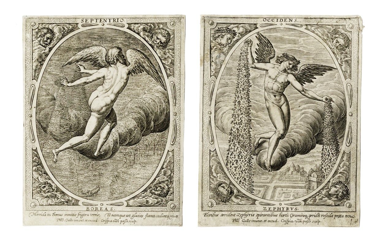 Acquaforte e bulino. mm 128/130x97/99. Hollstein, 568-571. Da invenzioni di Philips Galle. Composizione in ovale su lastra rettangolare con titoli in alto e in basso al centro. Al margine inferiore verso su due colonne e a seguire le indicazioni di responsabilità "Phls Galle inuent. et excud. Crispia.van passe scalp.". Serie completa e omogenea dedicata ai quattro punti cardinali raffigurati con i quattro venti che da ciascuno hanno origine. Ottime prove su carta vergellata sottile apparentemente priva di filigrana.