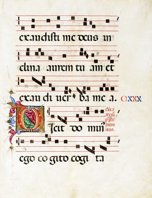 Manoscritto su pergamena a inchiostro nero e rosso, alcune lettere in blu. Scrittura tardo gotica con notazione musicale quadrata su tetragramma. Testo al recto: "[...] exaudisti me, Deus: inclina aurem tuam, et exaudi verba mea: Dicit Dominus: Ego cogito cogita / Testo al verso: tiones pacis, et non afflictionis. Invocabitis me, et ego exaudiam vos, et reducam captivitatem vestram[...]. Incipit con lettera D miniata al recto con motivi fitomorfi in blu, rosa, verde, arancio e oro.