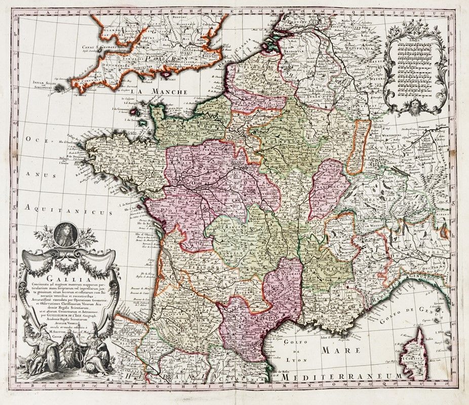 Incisione in rame in coloritura. mm 485x580. Foglio: mm 542x615. Bella mappa dell'antica Gallia pubblicata all'interno dell'Atlas Novus sive Tabulae Geographicae Totius Orbis Faciem e delineata su modello dell'analoga disegnata da Guglielmo De L'Isle.