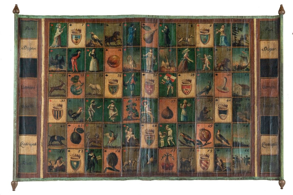 Olio su tela. cm 71x100. Sul tabellone in tela, che originariamente veniva conservato arrotolato intorno alle assicelle di legno fissate sui lati, sono dipinte 66 caselle quadrate, in ognuna delle quali sono rappresentate figure allegoriche, come la Fortuna o la Vanità, animali, frutti, maschere della Commedia dell'Arte e personaggi vari, oltre ad armi araldiche. Tra le armi araldiche compaiono lo stemma di Pisa (croce trilobata bianca in campo rosso) e i blasoni di famiglia pisane quali Agliati (scudo d'oro, a tre pali di nero), Rosselmini (d’azzurro, alla cometa d’argento, ondeggiante in palo) Gualandi o Gualandi del Carro (d'argento a tre bande di rosso), indizi che fanno supporre che il tabellone fosse in uso in ambito pisano. Il tabellone in tela è costituito da un una parte centrale più estesa e da due fasce laterali cucite, in alto e in basso bordo cucito in stoffa color verde.