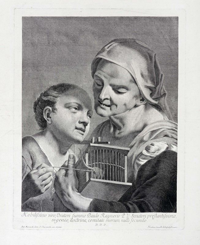 Bulino. mm 450x348. Foglio: mm 565x445. Da un dipinto di Antonio Marinetti detto il Chiozzotto (Chioggia, 1719- Venezia,1796). Al margine inferiore la dedica a Paolo Renier (Venezia, 1710 – 1789) politico e diplomatico e penultimo doge della Repubblica di Venezia, ancora in basso a destra la firma "Nicolaus Cavalli del. et sculp. Venetiis". Ottima prova su carta vergellata veneta con filigrana "lettere AS sormontate da decoro" e contromarca "lettera A".