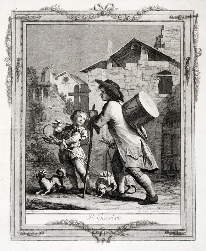 Acquaforte e bulino. mm 378x290. Foglio: mm 465x30. Marini, 64. Al margine inferiore da sinistra a destra sotto la composizione "Fran.co Maggiotto inv." e a seguire "Gio. Volpato Sculp. appo Nic. Cavalli Venetiis", più in basso al centro il titolo. Sui quattro lati attorno alla composizione è stata dipinta a pennello e acquerello grigio, verosimilmente poco dopo l'esecuzione dell'incisione, cornice decorativa a fiori e festoni. Tavola da Le arti per via, serie di 12 incisioni da invenzioni di Francesco Maggiotto. Bellissima prova su carta vergellata veneta con filigrana "tre mezzelune" e contromarca lettera "W".