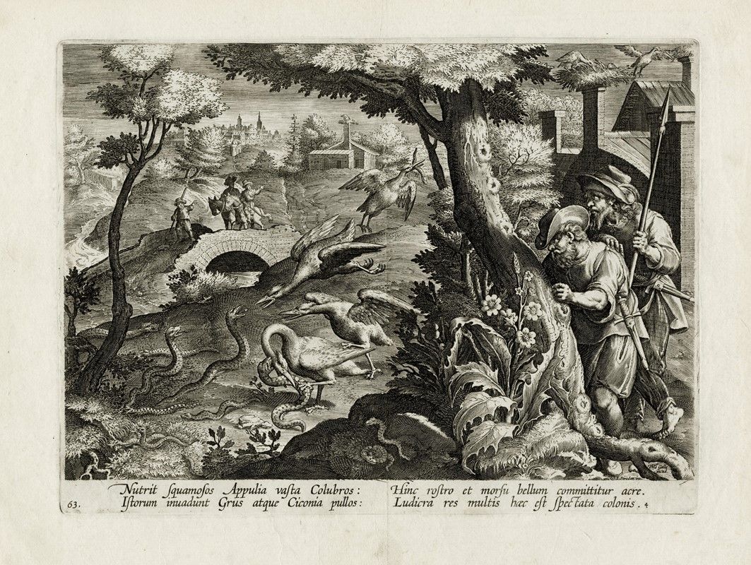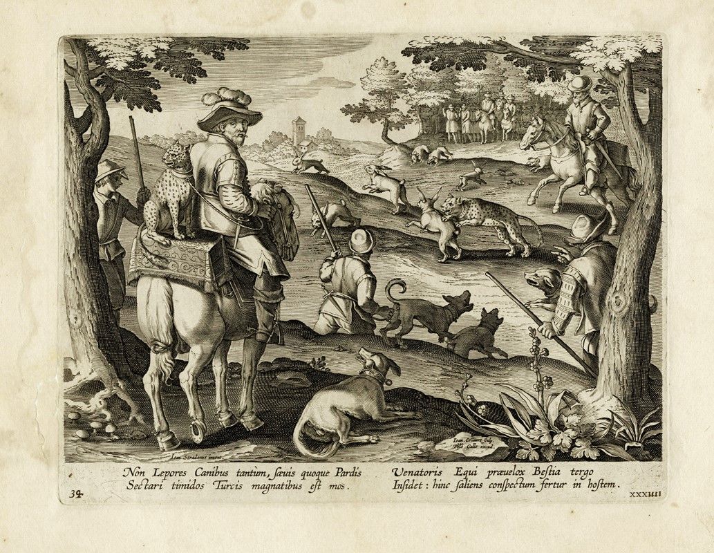 Bulino. mm 200/204x258/268. Foglio: mm 248/272x324/374. New Hollstein, 500, 508, 523. Tre tavole di Jan Collaert (Antwerp, 1561-1620 ca.) delle quali una attribuita. Numerate al margine inferiore a sinistra. Dalla serie Venationes ferarum avium piscium su invenzione di Jan van der Straet (Bruges 1523 - Firenze 1605) edita in origine nel 1578 con 43 tavole non numerate incise da Philips Galle e dedicate a Cosimo de Medici. La serie venne ampliata con ulteriori fogli incisi da Adriaen Collaert, Jan Collaert, Charles Galle I e Carel de Mallery e fu pubblicata ad Anversa nel 1596. Ottime prove su carta vergellata sottile con filigrana "P gotico" visibile su una tavola e contromarca "4" su altra.