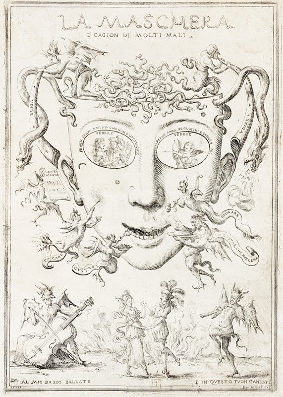 Acquaforte. mm 430x304. Foglio: mm 458x317. Bertarelli, 495. Con la data "1688" sulla lastra in basso a sinistra e la firma "G. M. Mitelli Ie F." a destra. Al centro della composizione una maschera con sembianze umane è circondata da figurine diaboliche e da rappresentazioni allegoriche che alludono alle tentazioni dei cinque sensi. In basso al centro una coppia danza tra due diavoli musici con in basso i motti "al mio basso ballate" e "e in questo tuon cantate". Bella prova su carta vergellata con filigrana "otto cerchi vuoti lungo i lati lunghi e parziale scritta ...ZANO".