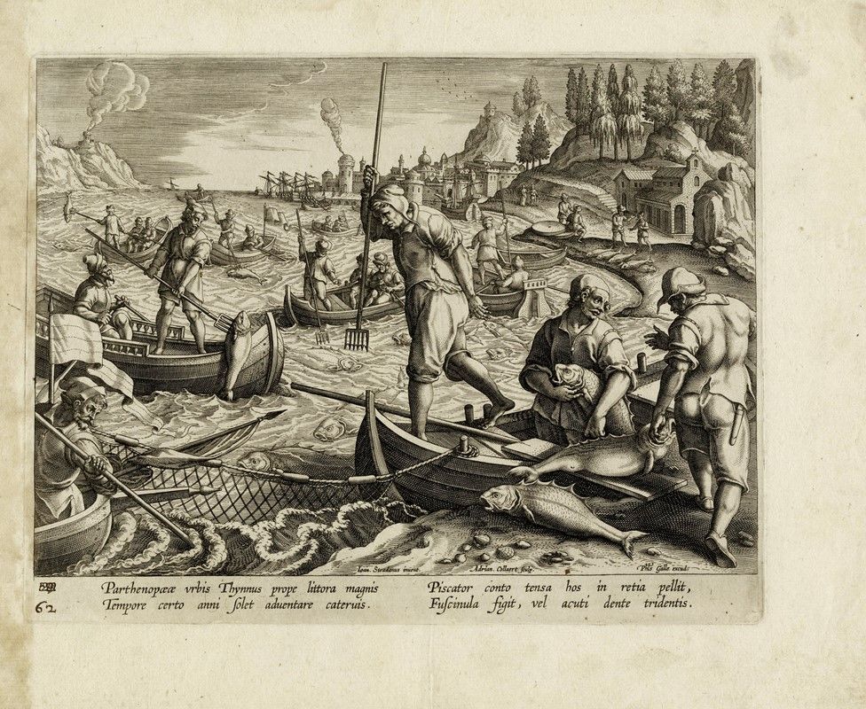 Bulino. mm 198x263. Foglio: mm 276x326. New Hollstein,494. Firmata da Adriaen Collaert (Antwerp, 1560-1618) sulla lastra in basso al centro. Al margine inferiore a sinistra il numero "62", e altro cancellato, a penna e inchiostro bruno. Dalla serie Venationes ferarum avium piscium su invenzione di Jan van der Straet (Bruges 1523 - Firenze 1605) edita in origine nel 1578 con 43 tavole non numerate incise da Philips Galle e dedicate a Cosimo de Medici. La serie venne ampliata con ulteriori fogli incisi da Adriaen Collaert, Jan Collaert, Charles Galle I e Carel de Mallery e fu pubblicata ad Anversa nel 1596. Ottima prova su carta vergellata sottile con filigrana "aquila".