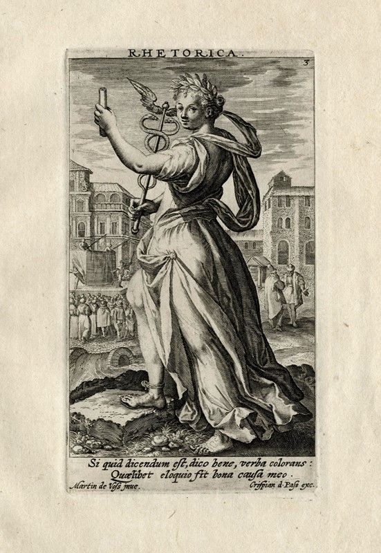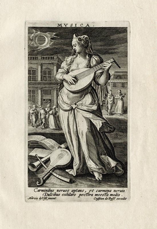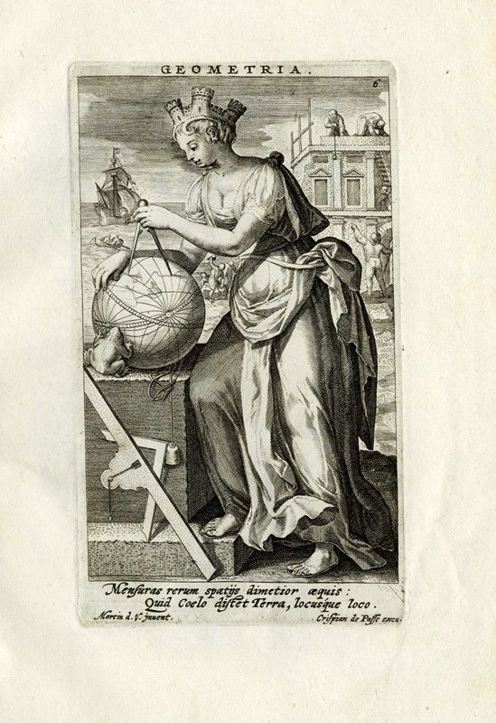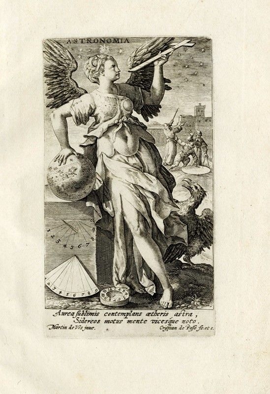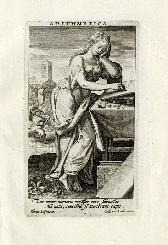 In-quarto (mm 290x190). Volumetto con legatura in cartonato pesante color ocra contenente nove carte, delle quali due carte bianche, una carta bianca con applicata a pieno la tavola con la Grammatica, e sei fogli integri a pieno margine con impresse le restanti sei Arti liberali, nell'ordine Dialectica, Rhetorica, Musica, Arithmetica, Geometria, Astronomia. Bulino. mm 158/163x89/95. Hollstein, 517-523. Serie composta da tavole numerate progressivamente in lastra all'angolo in alto a destra, con il titolo al margine superiore e all'inferiore due righe in latino e le indicazioni di responsabilità "Martin de Voss inuentor (o Martin d.V. invent)" e "Crispian (Crispin) de Passe excud.". Alla tavola con l'Astronomia si legge "Crispian de Passe fe.et e.". Bellissime impressioni su carta vergellata con filigrana "aquila" visibile su due tavole. La tavola 1 non omogenea. Alla prima carta marchio di possesso a inchiostro rosso del pittore su vetro parigino Adolphe-Napoléon Didron (Haulvillers, 1806-Parigi, 1867).