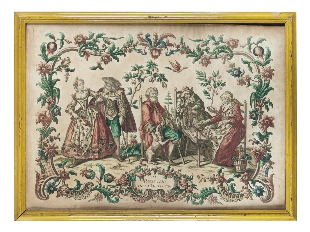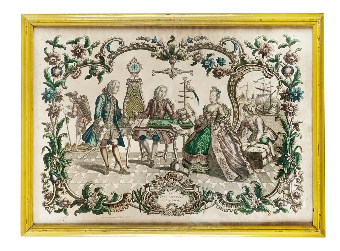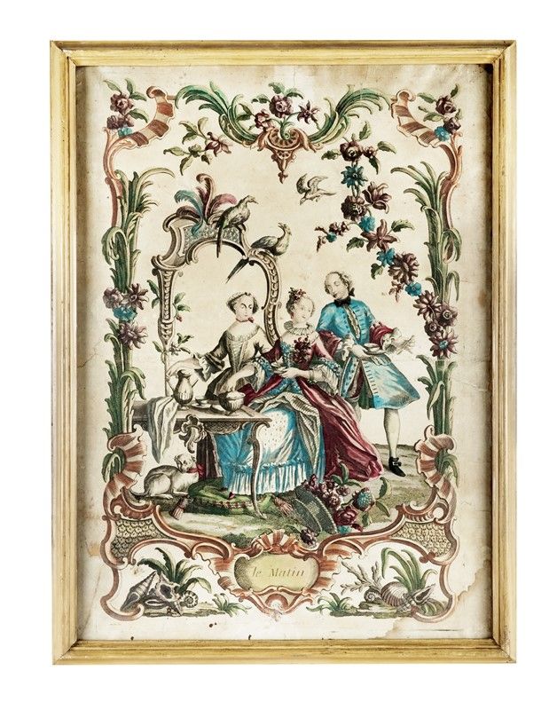Acquaforte in coloritura. mm 555x770. Serie di quattro grandi tavole dedicate alle occupazioni peculiari dei vari periodi della vita dell'uomo Su tutte compare l'indirizzo di Jean-François Daumont editore di vues d'optique, stampe popolari, carte da gioco, attivo a Parigi dal 1745 fino alla morte avvenuta nel 1768. Alla tavola con Les jeux innocents de l'enfance, in una voluta a sinistra del cartiglio con il titolo si legge Scotin L. G. da riferire forse a Gérard Jean-Baptiste Scotin le jeune (1698 - 1755 ca.) o ad altro componente di questa dinastia di incisori attivi dagli inizi del XVII secolo. SI AGGIUNGONO: Le Matin / L'Apres-Midy. A Paris chez Crepy rue S. Jacques à S.Pierre, 1730 ca. Acquaforte in coloritura. mm 775x770. / Voeu de Jephté. à Paris chez Charpentier rue St. Jacques au coq. 1750 ca. Acquaforte in coloritura. mm 800x1128.