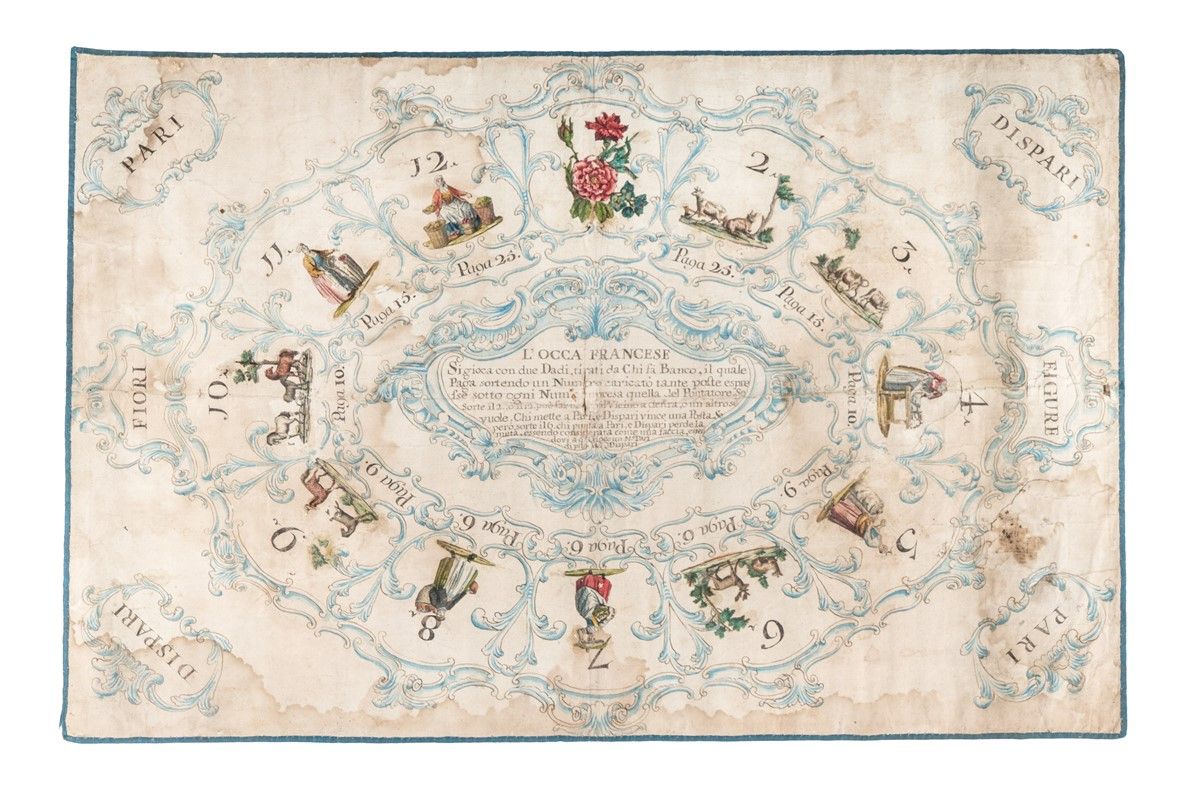 Penna e inchiostro bruno, pennello e acquerello azzurro e nero su spessa carta bianca vergellata. Scenette a stampa in coloritura ritagliate e applicate su ogni singola casella numerata. mm 542x793. Raro tabellone, disegnato e dipinto con inserti a collage, per gioco d'azzardo con i dadi e composto da 11 caselle in circolo numerate da 2 a 12, ai quattro angoli del tabellone gli scomparti del pari e dispari, al centro del lato sinistro il riquadro "fiori" e a destra "figure". Al centro grande cartiglio decorativo con le regole manoscritte: "Si gioca con due Dadi, tirati da Chì fa Banco, il quale Paga sortendo un Numero caricato tante poste espresse sotto ogni Numero compresa quella del Pontatore. Se sorte il 2, o il 12 può far [...] al Vicino a destra, o un altro se vuole. Chi mette a Pari, e Dispari vince una Posta. Se però sorte il 6, chi punta a Pari, e Dispari perde la metà, essendo considerata come una faccia, essendovi a questo Gioco un N°. Pari di più del Dispari". Assimilabile al "Giuoco della Barca", uno dei più antichi e popolari giochi d'azzardo che ha avuto numerosissime varianti tra le quali il "Gioco dell'Arlecchino", il "Gioco dell'Agricoltura e Commercio", il "Gioco degli Eroi dell'Impero Francese", il "Gioco dell'Ebreo".