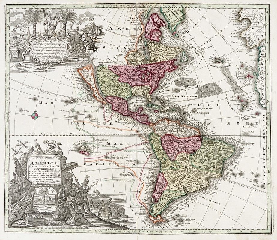 Incisione in rame in coloritura. mm 505x585. Foglio: mm 540x625. Dettagliata mappa delle Americhe, una delle ultime stampate con la California insulare. La carta raffigura le Americhe e parti di Francia, Spagna, Portogallo e Africa occidentale visibili al suo confine orientale. Nel Nord America compare il presunto Stretto di Anian (Fretum Anian) che la separa dalla leggendaria Terra Esonis a nord. A est della California, il fiume Anian, raffigurato al posto del fiume Columbia, allude alla favoleggiata esistenza di un passaggio a nord-ovest, insieme allo Stretto di Anian. A nord di questo fiume si trova il Pays de Moozemleck, un altro elemento congetturale riscontrato anche nelle mappe dell’America del contemporaneo di Seutter, Johann Baptist Homann.