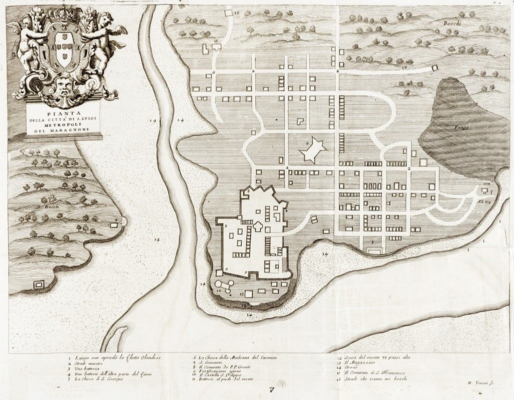 Incisione in rame. mm 375x508. Foglio: mm 418x548. Al margine inferiore a destra la firma dell'incisore Hubert Vincent. Al margine superiore in fondo a destra "N. 4". Mappa facente parte delle ventitre a corredo del raro resoconto di Padre de Santa Teresa sulla guerra coloniale olandese-portoghese. Carta vergellata con filigrana "agnello pasquale in doppio cerchio e lettere A N"(Italia, 1680).