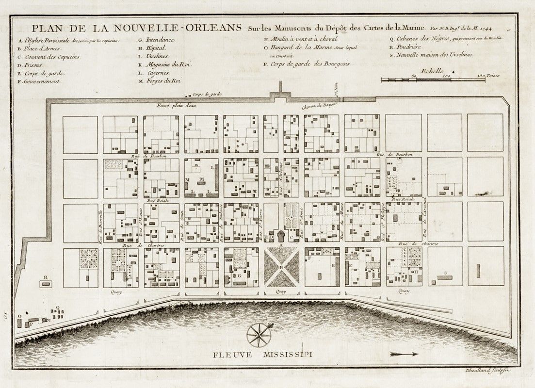 Incisione in rame. mm 205x290. Foglio: mm 222x360. Mappa dettagliata di New Orleans, tratta dalla pianta manoscritta della città redatta da Le Blond de la Tour nel 1722. La città è disposta simmetricamente e ciascuna strada è nominata individualmente. Sono delineati i confini di ogni lotto di proprietà e segnata la collocazione di ogni edificio. In alto legenda con 18 rimandi a specifici edifici situati sulla mappa (include ospedale, prigione, chiesa, deposito di armi, ecc.). Sono presenti anche molti altri edifici resi in forma schematica, nonché giardini, appezzamenti di terreno, ecc. Le acque del Mississippi sono raffigurate con tratti ondulati particolarmente fini e riportato il canale che corre lungo il lato orientale della città, costruito nel 1729.