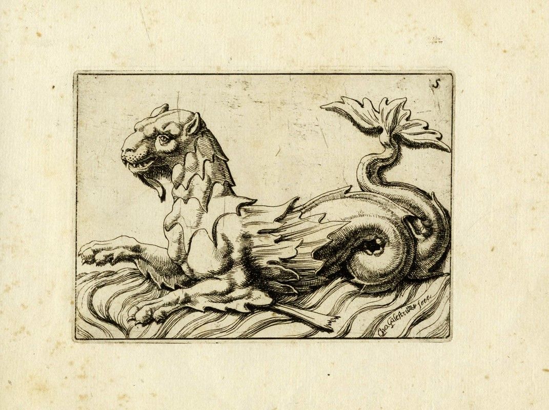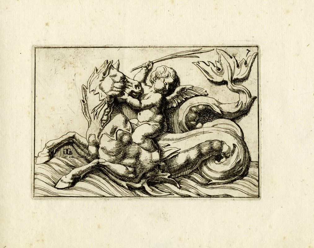 Acquaforte. mm 85x124. Foglio; mm 147/150x196/200. Quindici incisioni da Tritoni e mostri marini serie in diciotto tavole quasi tutte firmate o siglate sulla lastra e numerate in alto a destra. Belle impressioni su carta vergellata lievemente rigida con frammento di filigrana "fiore di giglio in cerchio singolo" visibile alla prima tavola.