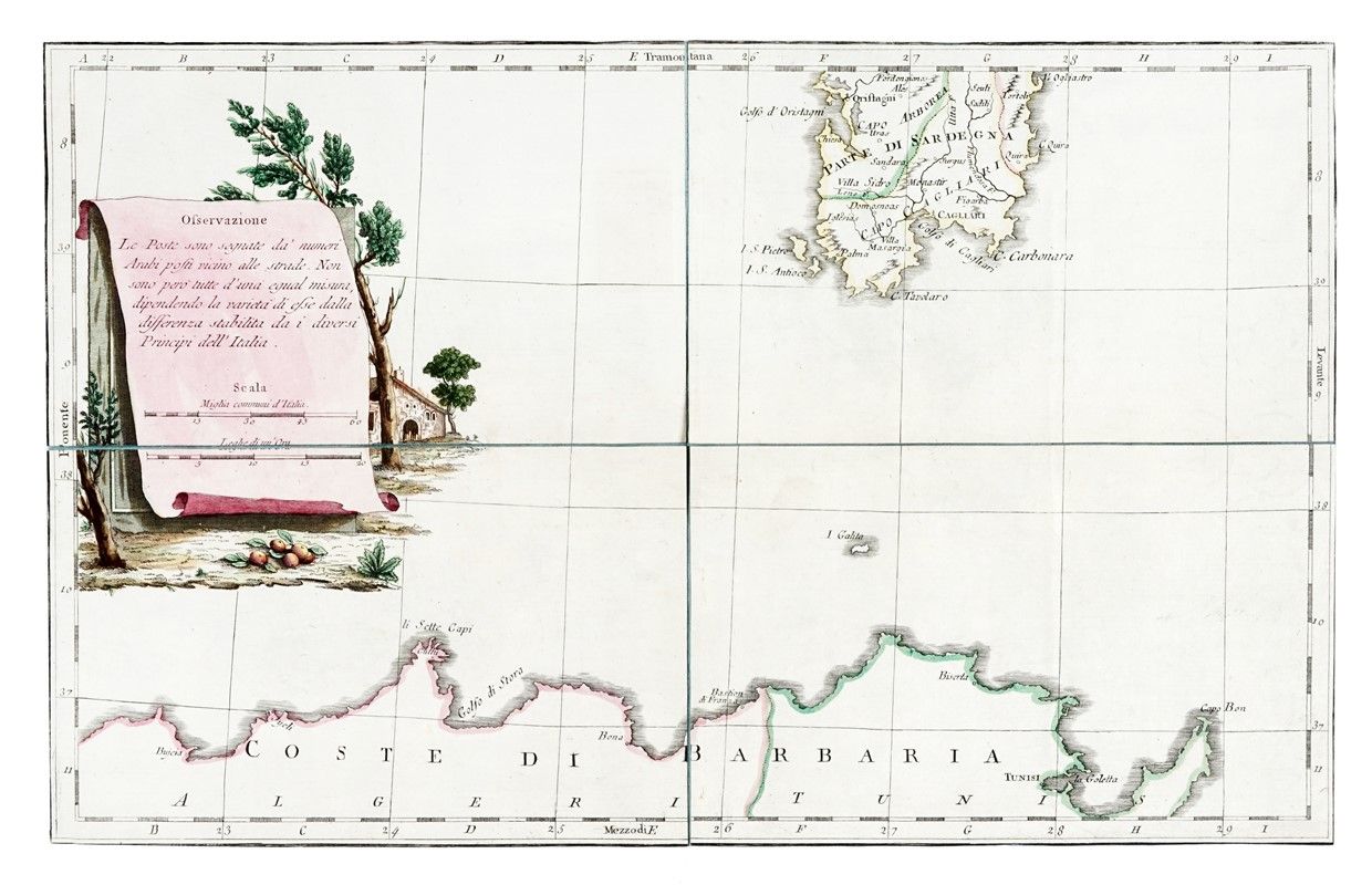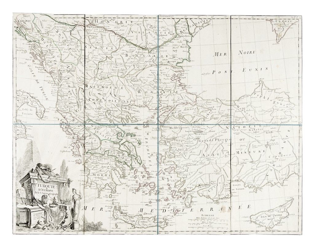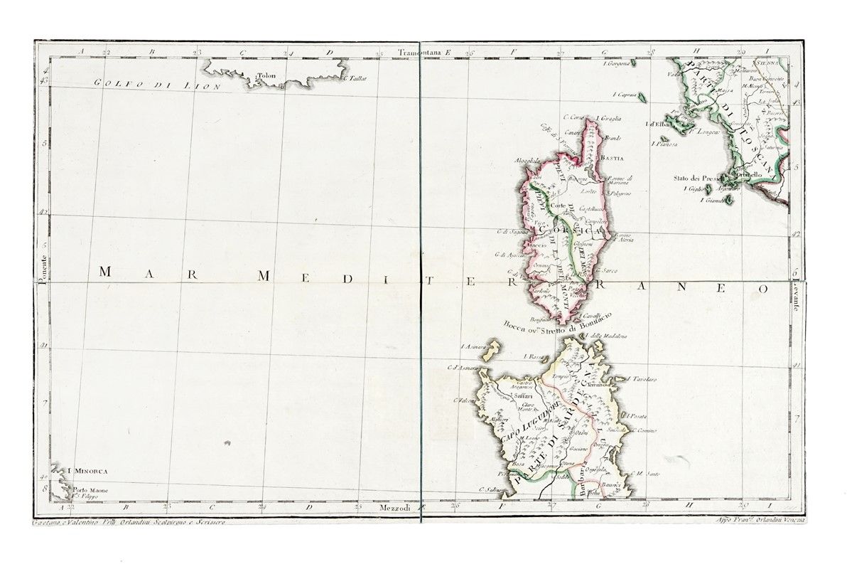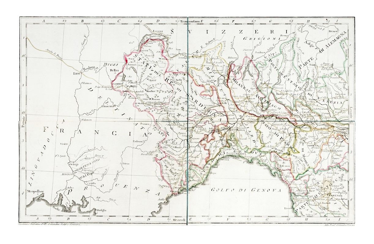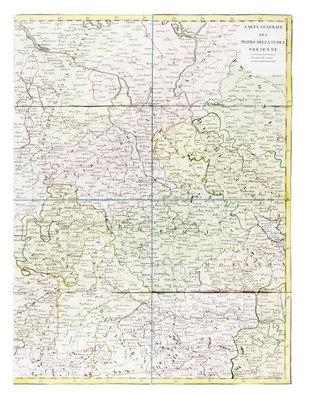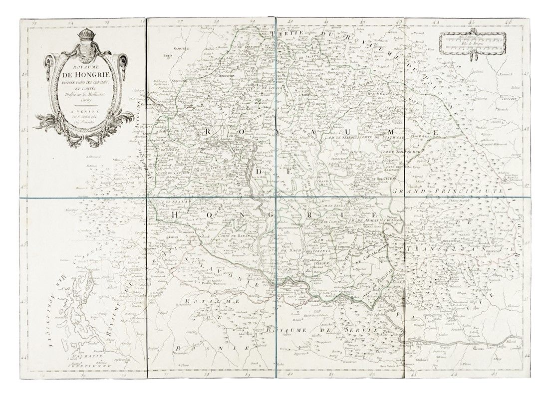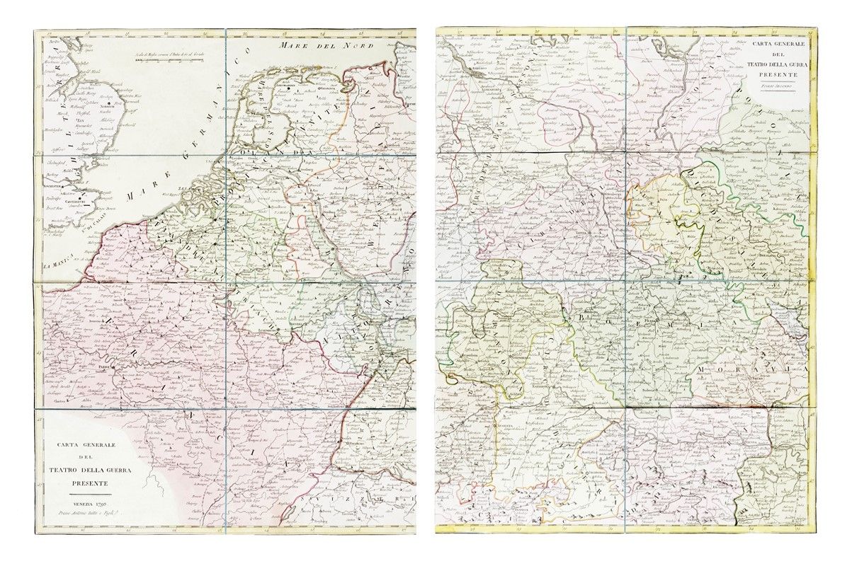 1) L'Italia in sei fogli divisa ne' suoi differenti stati, regni, e repubbliche con tutte le strade Maestre, colle distanze di tutte le Poste, che in essa si comprendono,... In Venezia, Appo. Francesco Orlandini,1786. Incisione in rame con coloritura coeva dei confini in 6 tavole ciascuna di 4 fogli a stacco. Formato aperto di ciascuna tavola: mm 260x418. Formato chiuso: mm 210x130. 2) S.M.(?). Ducato di Mantova con parte del Dominio Veneto, e del Milanese, et altri Stati circonvicini. Si vende da Vettor Romagni a Ss. Felipo e Giacomo a Venezia. 1680. Incisione in rame su 4 fogli a stacco. Formato aperto: mm 338x500. Formato chiuso: mm 258x168. Carta centrata sul Ducato di Mantova e il Lago di Garda con Brescia e Verona ma che include anche gli stati limitrofi del Milanese, Bergamasco, Parmense, Modenese, Pavese e Ferrarese. Il Ferrari (Mantova nelle stampe, n. 322), la descrive come “la prima carta geografica del Ducato basata su dati attendibili e compilata con rigore scientifico”. II stato con l’indirizzo di Vettor Romagni, stampatore del XVIII secolo, ai SS. Filippo e Giacomo a Venezia, in basso a sinistra sotto la scala metrica. 3) Carta generale del teatro della guerra presente. Venezia, presso Antonio Zatta e Figli,1793. Incisione in rame in coloritura, in 2 tavole di 8 fogli a stacco. Formato aperto: mm 633x480 cad. Formato chiuso: mm 240x160. 4) Turquie d'Europe Par le S. Janvier Geographe. A Venise par François Santini...Chez M. Re.dini, 1784. Incisione in rame in 8 fogli a stacco. Formato aperto: mm 488x638. Formato chiuso: mm 240x160. 5) Royaume de Hongrie divisée dans ces cercles et comtés. A Venise: par P. Santini, 1784 Chez Remondini. Incisione in rame in 8 fogli a stacco. Formato aperto: mm 470x675. Formato chiuso: mm 235x170. 6) L'empire d'Allemagne divisé par cercles... A Venise: par P. Santini, [s.d.]. Incisione in rame in 8 fogli a stacco. Formato aperto: mm 470x645. Formato chiuso: mm 235x162. Interessante raccolta di carte che include i territori italiani, dell'Ungheria, degli stati dell'Est Europa, nonché della Germania, riunite dal collezionista in cofanetto in piena pelle con i titoli impressi in oro su un lato, custodia interna in cartone marmorizzato. Tutte le mappe sono intelate su seta azzurra con tassello in pelle e impressione in oro per il titolo.