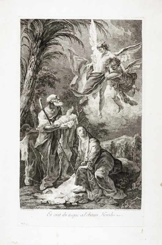 Acquaforte e bulino. mm 580x352. Foglio: mm 695x500. In controparte dal dipinto di Giovan Battista Tiepolo databile al 1720 ca. oggi al San Diego Museum of Art (inv. 1942:127). Al margine inferiore da sinistra "Gio. Batta Tiepolo Pinx", all'estremità destra "Berardi Scul app. Wagner Venezia C.P.E.S". Al centro il verso dal Vangelo di Matteo (capitolo 2) "Et erat ibi usque ad obitum Herodis". In basso a sinistra "No.30.4". Splendida prova di questo foglio non comune su carta vergellata veneta con filigrana "tre mezzelune".