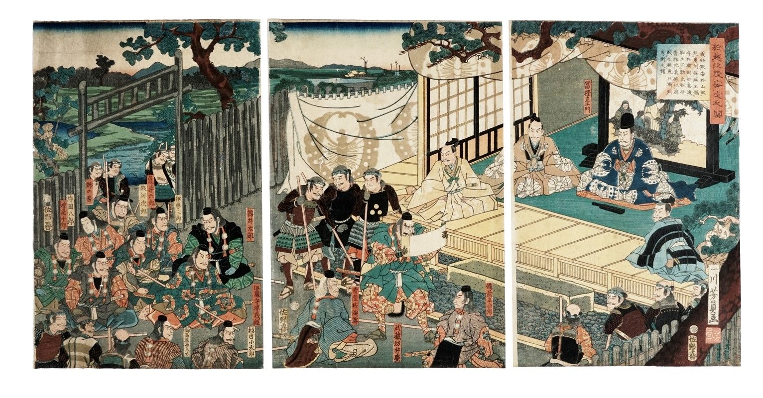 Nishike-e (xilografia a colori). Formato: trittico in tavole sciolte (365x245 mm foglio, mm 364x730). Allievo di Utagawa Kuniyoshi attivo fino al 1870 circa, ricordato per immagini di battaglie, di guerrieri, uccelli e fiori e illustrazioni di Kusazoshi.