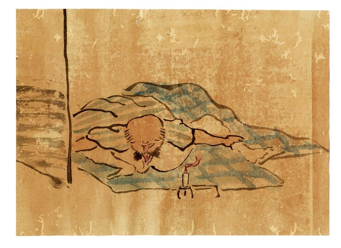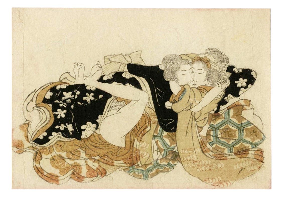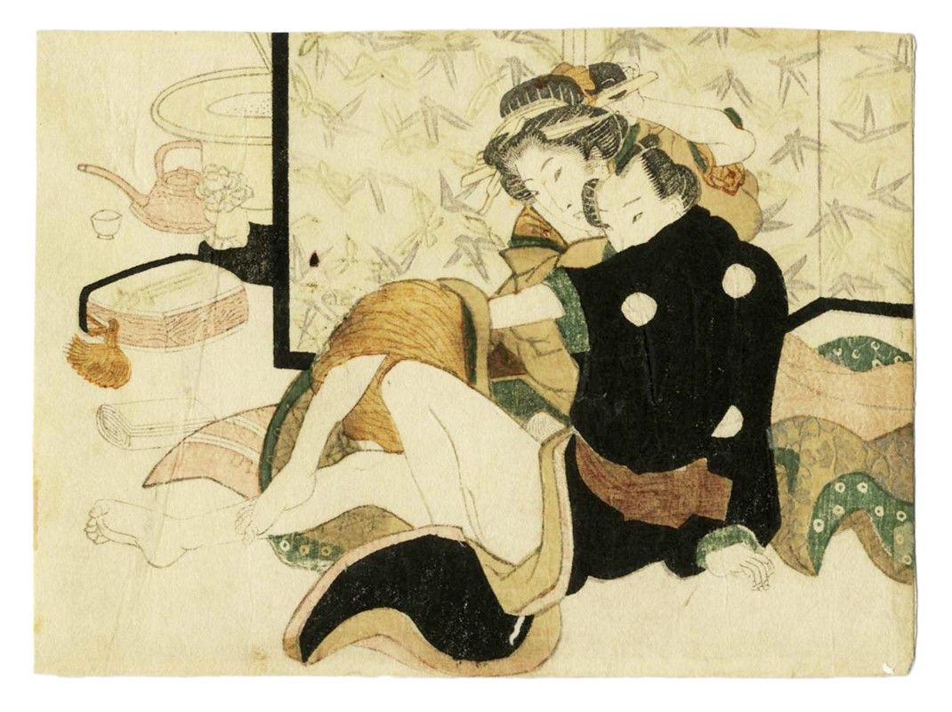 Pennello e acquerello a colori. mm 230x318. Audace e insolita scena erotica tracciata con il piglio comico caratteristico dell'artista. SI AGGIUNGONO: Keisai Eisen [da], Tre tavole shunga presumibilmente da Keisai Eisen non firmate. Dimensione cadauno 90x120. Colori affievoliti, difetti di conservazione e tracce d’uso.