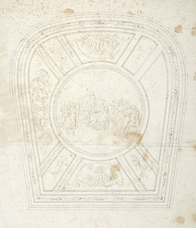 Penna e inchiostro bruno su carta non vergellata color avorio. mm 395x343. Verosimilmente progetto di decorazione per il soffitto di un teatro all'italiana.