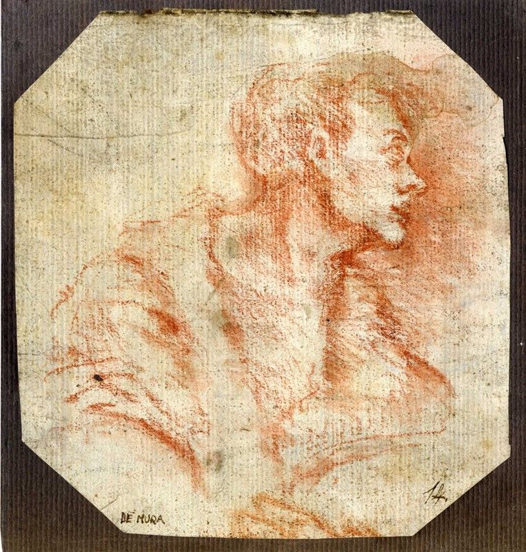 Matita rossa su carta vergellata color crema. Foglio resecato agli angoli. mm 145x135. In basso a sinistra "DE MURA" e a destra "14" a penna e inchiostro bruno. Applicato a pieno su cartoncino color marrone.