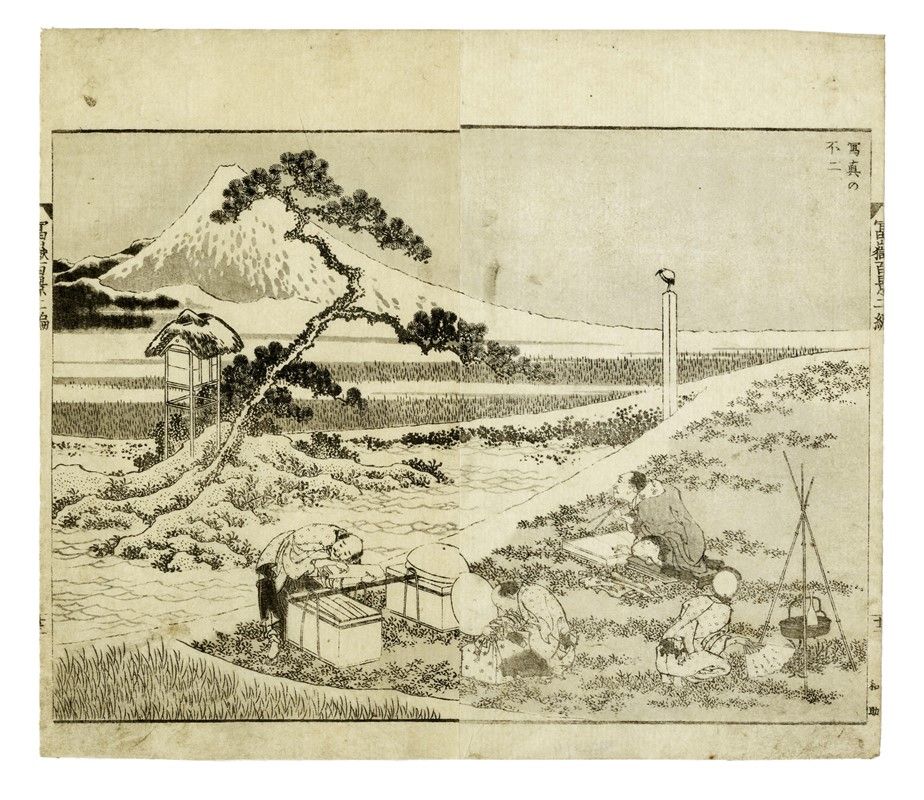 Xilografia in bianco/nero e grigio (sumizuri-e). Pagine 16 e 20 impresse su due lati con xilografie 24, 25, 31 e 32 da Fugaku hyakkei (Cento vedute del Monte Fuji, vol. 3). Veduta del Fuji sotto un ponte /Fuji con un’;impalcatura/La montagna sopra la brughiera di Musashino/La montagna incorniciata in un cerchio di Kaya che dipende da un Tori-i. Editore: Eirakuya T?shir?, Nagoya. Data: c. 1860-1875.