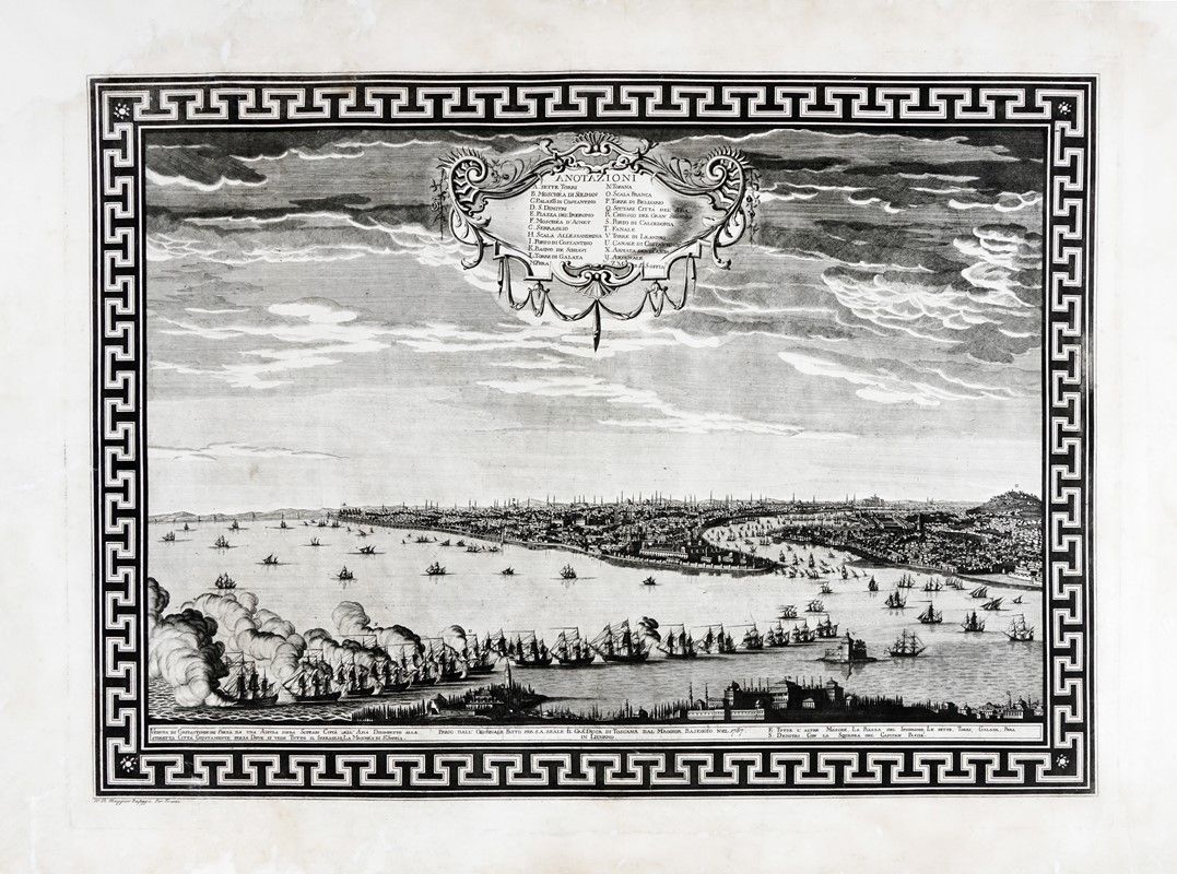 Acquaforte. mm 570x770. Foglio: mm 695x995. Al margine in basso a sinistra sotto la cornice "n°.53. Maggior Baseggio Per Firenze". Bellissima veduta aerea inquadrata entro una cornice a greca su fondo nero con rosette ai quattro angoli. Al margine inferiore, a sinistra e a destra, titolo su doppia colonna; al centro la scritta "Preso dall'originale fatto per S. A. Reale il Granduca di Toscana dal Maggior Baseggio nel 1787 in Livorno". Al centro veduta aerea di Costantinopoli presa dalla collina vicino a Scutari, con un gran numero di imbarcazioni a vele spiegate sul primo piano, delle quali diverse che cannoneggiano. In alto al centro elaborato cartiglio festonato per le "Annotazioni" con 24 richiami. Stampa di grande rarità impressa in due varianti, la presente e altra priva dei dati editoriali e del cartiglio con la legenda. Bellissima impressione stampata con contrasto netto e brillante su carta vergellata apparentemente priva di filigrana.