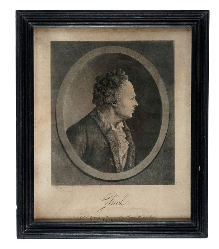 Acquaforte e acquatinta. mm 240x190. Coppia di ritratti realizzati con physionotrace. Al margine inferiore del ritratto di Mozart: "dess. et Gravé par Quenedey d'aprés un portait, en allemagne / W. A. Mozart / Se vend chez l'Auteur, rue neuve-des-Petits-Champs, N. 1284, A Paris & chez Naderman, M. de Musique, rue de la Loi, passage de Foi / Dép. a la Bib. Imp.". Il ritratto di Gluck è tratto da un busto in terracotta (1774), di Jean-Antoine Houdon (1741-1828). Al margine inferiore si legge "dess. au Physionotrace et Gravé par Quenedey d'aprés le Buste de Gluck / Se vend chez Quenedey rue Neuve-des-Petits-Champs, N. 15, a Paris / Dép. a la Bib. Imp.".