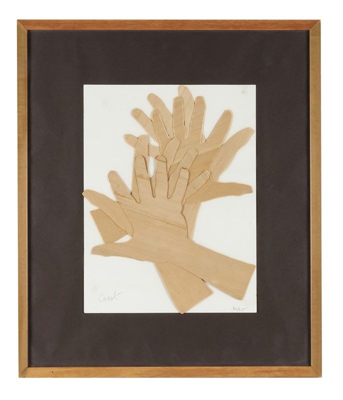 Compensato applicato a carta greve. cm 40x30. Firma a matita in basso a sinistra e tiratura in basso a destra. A fianco della tiratura è presente il timbro a secco de La biennale di Venezia del 1969.