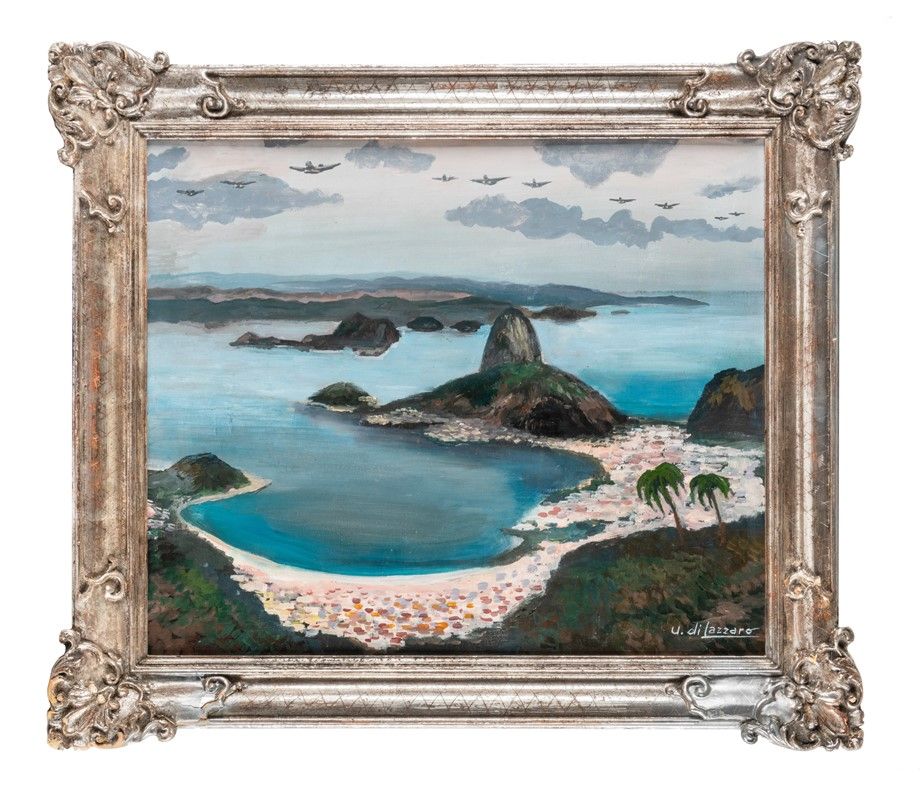 Olio su tavola. cm 55,5x64,5. Firmato in basso a destra. Titolato nel bellissimo timbro con cavallo alato posto al verso della tavola. Ulteriore timbro marchiato a fuoco di Franco Ristori di Firenze applicato al verso della cornice. La figura dell'aereo in volo è una costante nell'operato di Di Lazzaro. Molteplici sono gli esempi nei manifesti, come nelle sue serie di crociere aeree, mentre in pittura si conoscono pochi esemplari di così elaborata fattura.