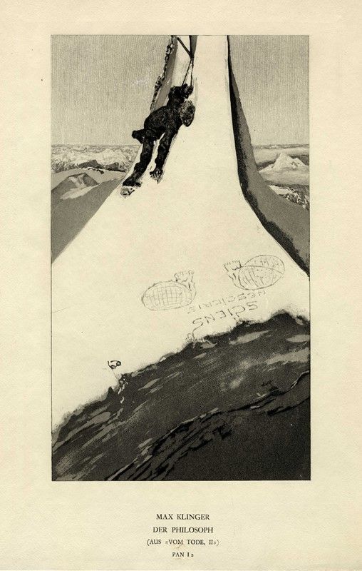 Acquaforte e acquatinta. mm 297x199. Foglio: mm 355x260. SINGER, 244. Stampato nel margine inferiore, al centro: «Max Klinger / Der Philisoph / (Aus «Vom Tode, II») / Pan I 2». Incisione tratta dal periodico d'arte Pan, vol. I, n. 2 (Luglio-Agosto 1895). Editore: Genossenschaft Pan GmbH, Berlin. Stampatore: Otto Felsing, Berlin. Incisione nel III stato su 3.
