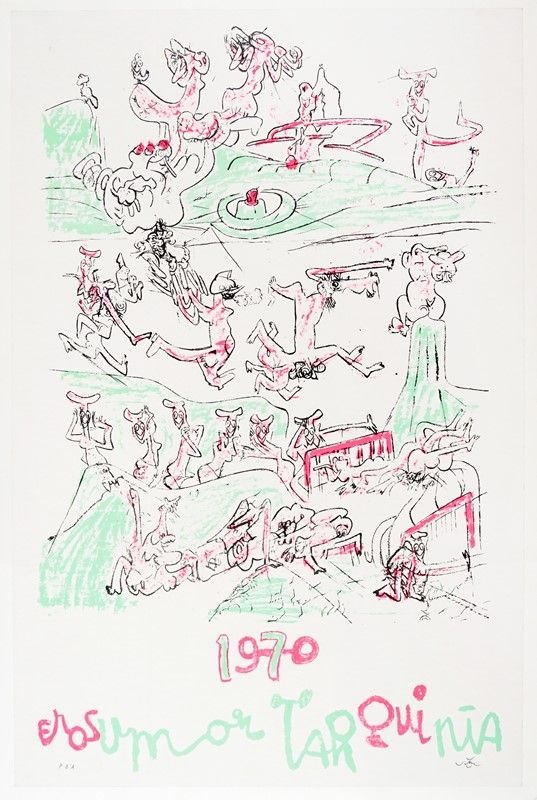 Serigrafia a 3 colori. mm 840x560. Monogramma a matita in basso a destra e "P.D'A" in basso a sinistra. Opera pubblicata a pagina 16 dell'Index dell'Opera Grafica dell'artista dal 1969 al 1980. Tiratura di 200 esemplari stampati in occasione della prima mostra di una proposta di Matta al Comune di Tarquinia per istituire una Biennale della Caricatura Politica Internazionale. Edizione del 1970 del Comune di Tarquinia. Bellissima prova d'artista.