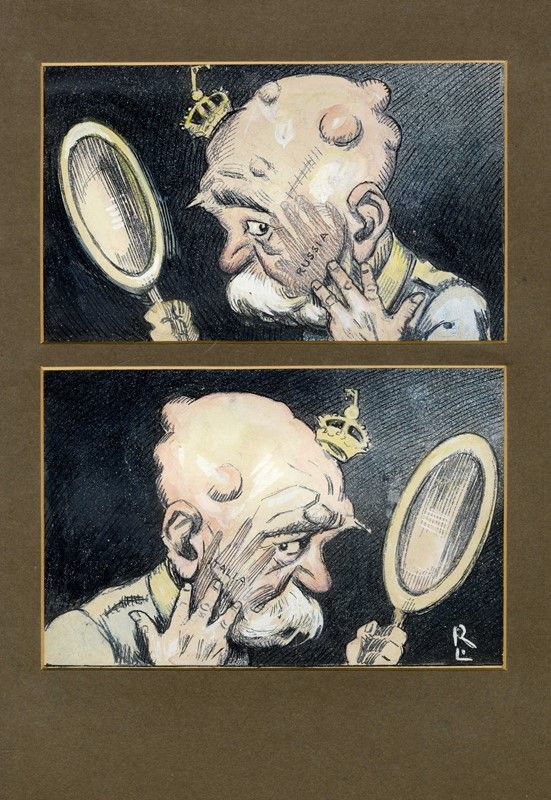 Penna e inchiostro di china nero, guazzo, pastelli grassi e matita su fondo a stampa. mm 140/150x230. Siglato "R. L." (Rata/Langa) in basso a destra.