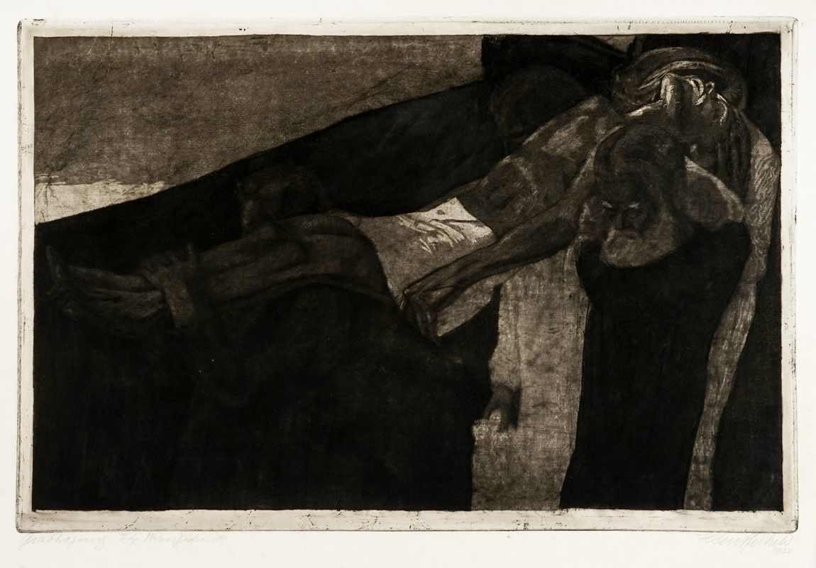 Acquaforte e rotella. mm 360x535. Foglio: mm 410x575. Firmata e datata a matita in basso a destra. Titolata e numerata a matita in basso a sinistra. In questa incisione Seufferheld riprende lo stesso soggetto di Die Grabtragung Christi del 1905-6 ma in controparte, modificando leggermente il volto di Cristo e accentuando le ombre delle figure. Es. III/X.