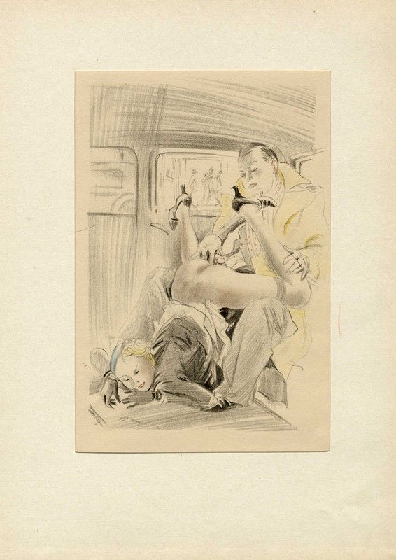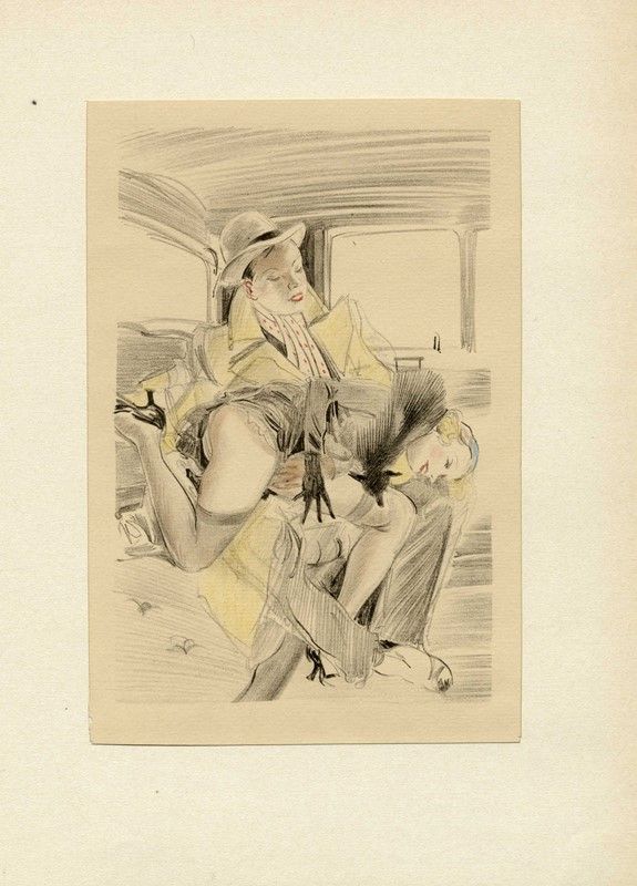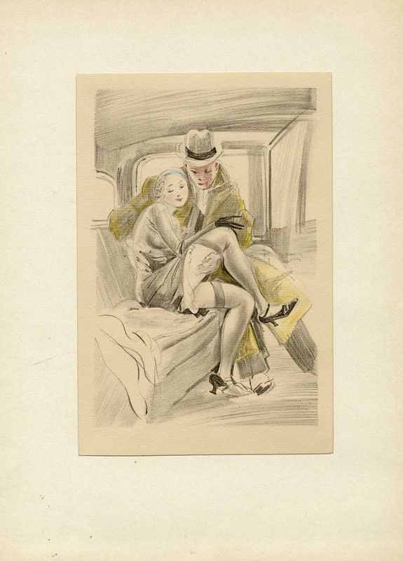 Raccolta di 31 tavole (compresa la prima recante il titolo) in litografia ritoccate a pastelli colorati contenute entro cartella in cartone e tela con lacci di stoffa. mm 170x110 ca. cad. Fogli: mm 280x190 cad. Ognuno parzialmente montato su passe-partout al margine destro di ogni foglio. Titolo impresso in nero sul piatto anteriore. Giustificazione di tiratura a stampa su carta vergellata applicata. Es. 275/516 recante le iniziali dell'editore Henri Pasquilenni iscritte a penna a sfera rossa.