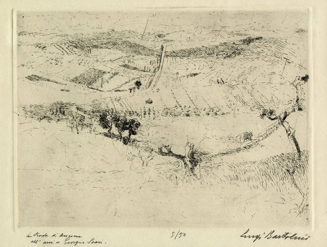 Acquaforte. mm 240x320. Foglio: mm 360x445. Siglata, datata e titolata in lastra in basso a sinistra. Controfirmata a matita in basso a destra, controtitolata a matita in basso a sinistra sopra la dedica. Numerata a matita in basso al centro. Acquaforte poi inserita nella cartella Canti di Giacomo Leopardi, contenente cinque poesie e due incisioni originali di Bartolini, edita da Bucciarelli nel 1962. Es. 5/50.