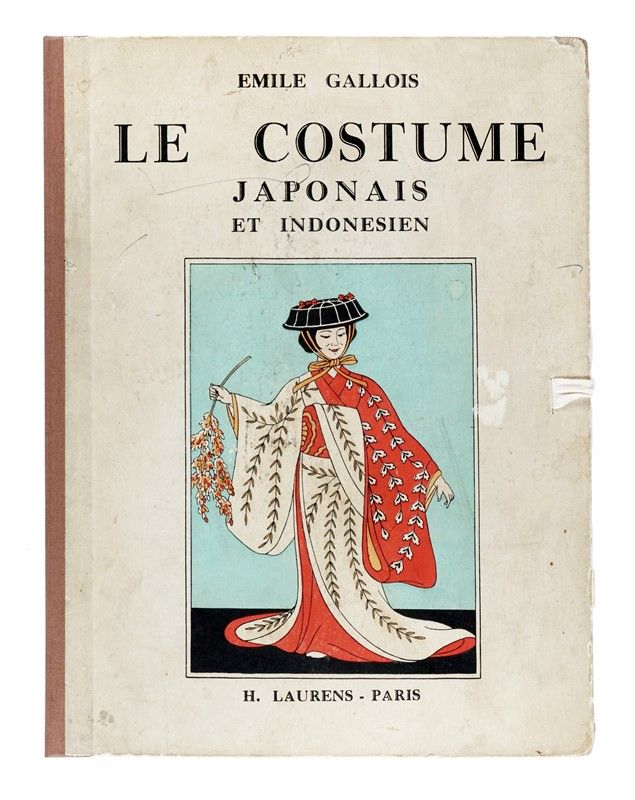 Raccolta completa di 48 tavole in litografia e pochoir con nobilitazioni in oro e argento contenute entro cartella in cartone e laccio in stoffa. mm 260x180 ca. cad. Fogli: mm 320x250 cad. Ognuna firmata e numerata progressivamente in lastra lungo il margine inferiore. Titolo, dati editoriali, prefazione ed indice delle plance a stampa su piccolo pamphlet rilegato. Bella raccolta di costumi che spaziano dall'abbigliamento comune a quello di corte, 38 di queste dedicate al Giappone, le restanti 10 illustrano invece l'estetica indonesiana.