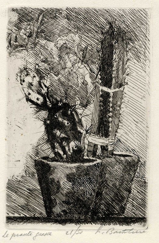 Acquaforte su velina applicata. mm 185x120. Foglio: mm 350x280. Firmata a matita in basso a destra, titolata a matita in basso a sinistra. Numerata a matita in basso al centro. Es. 21/50.