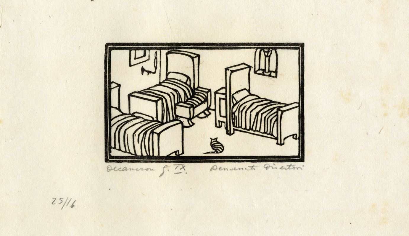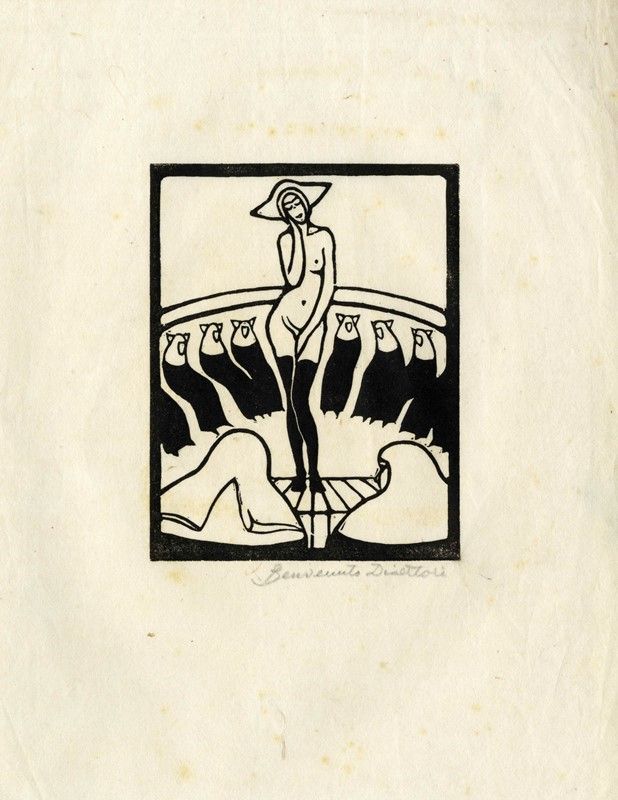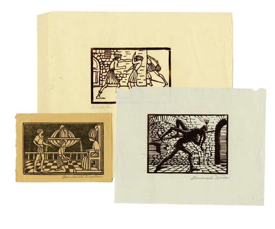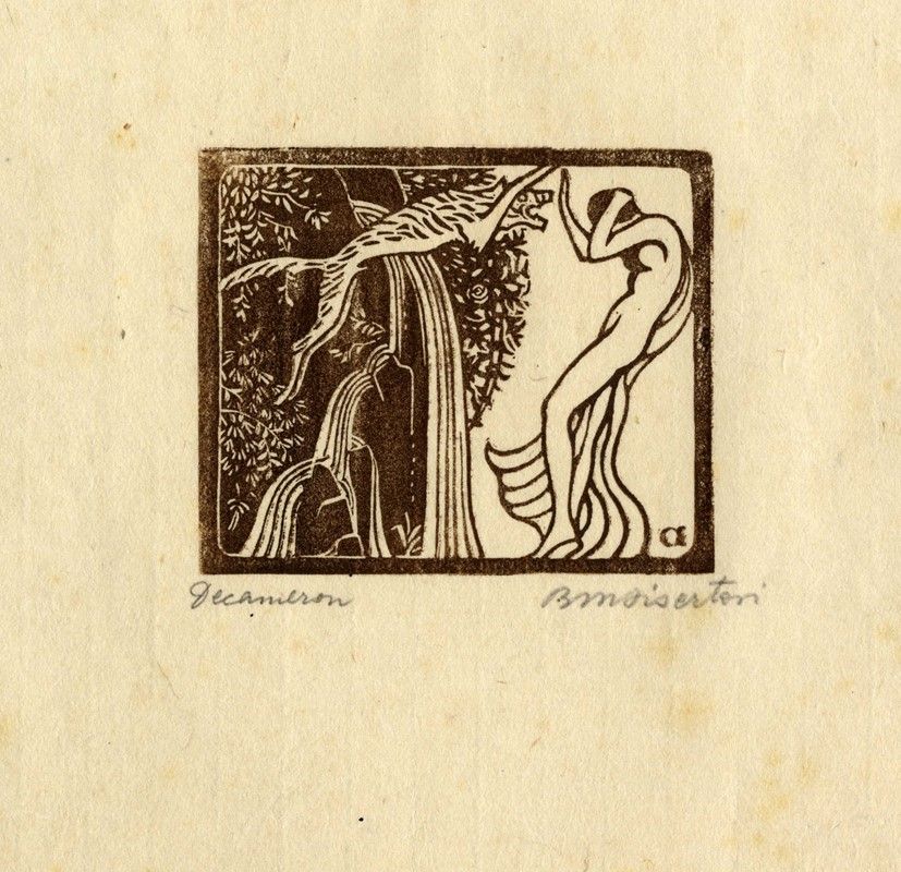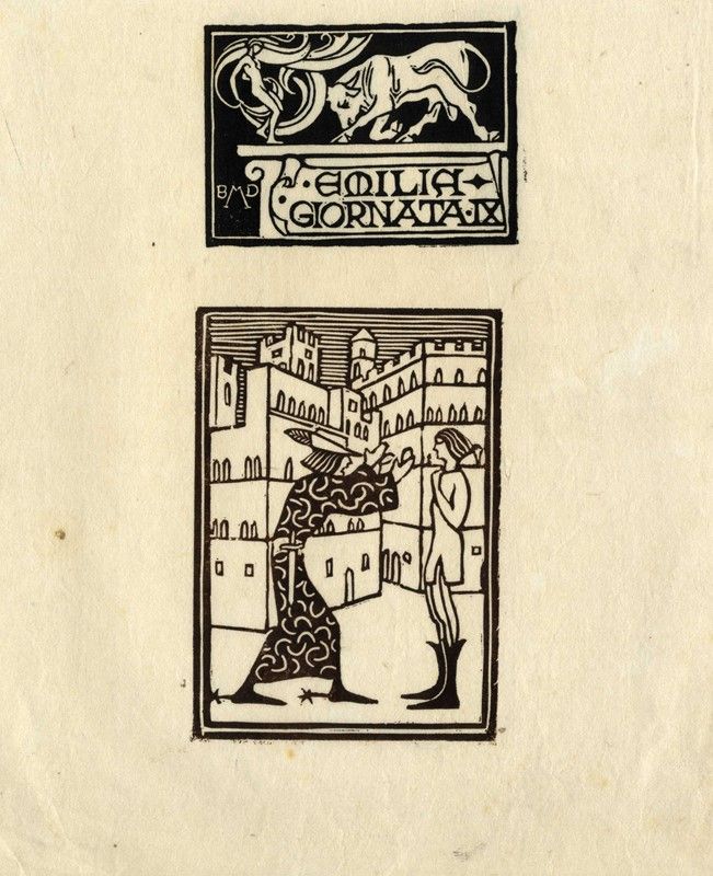 Raccolta di 10 xilografie. mm 50/130x70/120. Fogli: mm 90/290x120/230. Nove firmate a matita o penna e inchiostro di china in basso a destra. Cinque titolate a matita in basso a sinistra. Emilia - Giornata IX (frontespizio) figura due volte, sia incisa singolarmente che su uno stesso foglio di Novella quarta. Provenienza: Eredi Disertori.