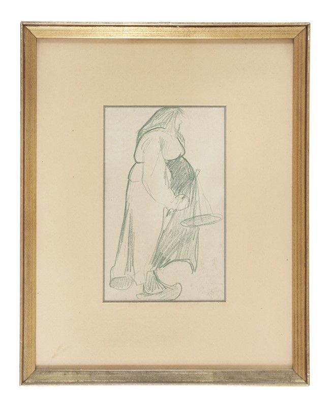 Coppia di disegni, uno a penna e inchiostro di china bruno, l'altro a pastello celeste. mm 180/190x115/120. Entrambi recanti etichetta di Galleria D'Arte La Navicella di Viareggio con doppi timbri della stessa, ciascuna applicata al verso della cornice. Titolo iscritto a penna al verso. Compongono il lotto Viandante e La pescivendola.