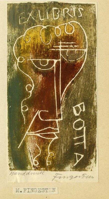 1) Ex libris Botta. 1942. Linoleografia. mm 120x60. Foglio: mm 130x65. MIRABELLA-BARDAZZI-BALLERINI, 436. Firmata a matita in basso a destra. "Handdruck" a matita in basso a sinistra. 2) G. B. 1942 ca. Linoleografia. mm 120x70. Foglio: mm 120x70. Firmata matita in basso a destra. "Handdruck" a matita in basso a sinistra. Entrambi gli esemplari possono presentarsi con diverse colorazioni.